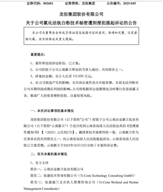 10月14日晚间,龙佰集团发布公告称,公司控股子公司云南新立钛业有限公司(以下简称云南新立)作为共同原告之一,就技术秘密被侵犯向云南省高级人民法院提起诉讼,涉案金额合计13.105亿元。