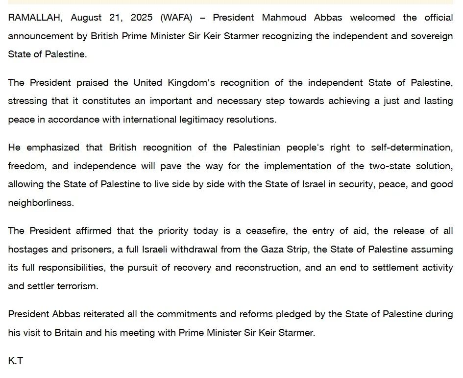 9月21日,巴勒斯坦通讯社“WAFA”报道,总统马哈茂德·阿巴斯对英国首相基尔·斯塔默正式宣布承认巴勒斯坦独立主权国表示欢迎。该报道表明了当下的一些首要任务,但并未提及赔偿问题。