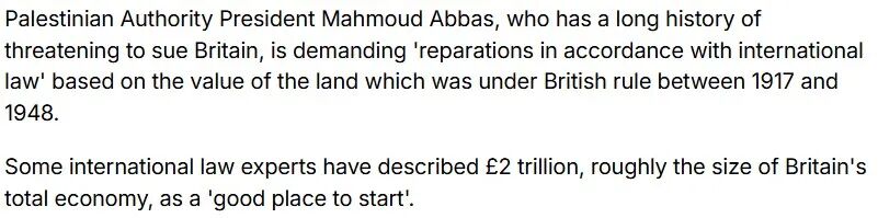 近期,社交平台有传言称,“巴勒斯坦向英国寻求2万亿英镑赔款,巴勒斯坦民族权力机构主席马哈茂德·阿巴斯在获得承认后,援引国际法要求英国就其在1917年至1948年的统治作出赔偿。”