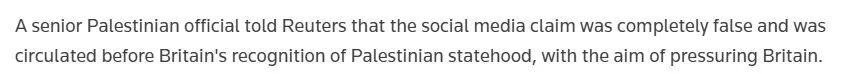 路透社10月7日发布的核查报告指出,一名巴勒斯坦高级官员表示,“巴勒斯坦向英国寻求2万亿英镑赔款”这一说法完全是错误的,是在英国承认巴勒斯坦建国之前就流传的,目的是向英国施压。