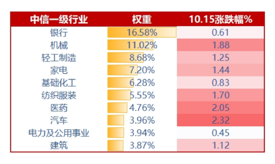 标普A股红利指数前十大行业今日全部收涨,其中医药、汽车板块涨幅超2%,机械、轻工制造、家电板块也均涨超1%。