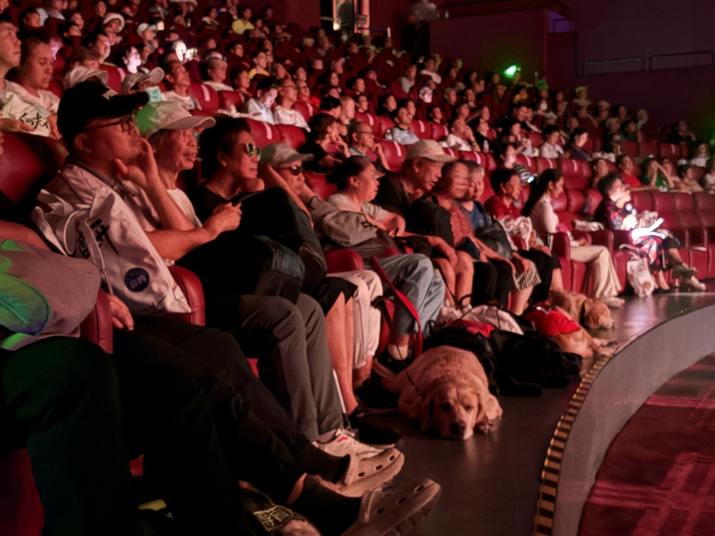仔细看观众席,有人戴墨镜,有人歪着脑袋,几只导盲犬安静地卧在座椅旁,观众不是在看电影,而是在“听”电影。