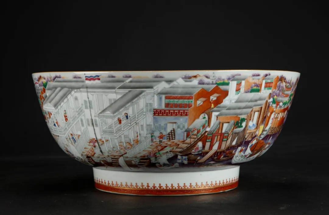 广东省博物馆一级文物“清乾隆广彩十三行通景图大碗”,其外壁以通景彩绘方式描绘了广州十三行商馆的面貌,上面绘有丹麦、大革命前的法国、奥地利、瑞典、英国和荷兰的国旗,还有炮台、粤海关以及无数的小船、船夫、正在谈话的中外商人、包装和搬运茶叶的情景、装车舢板等场景。