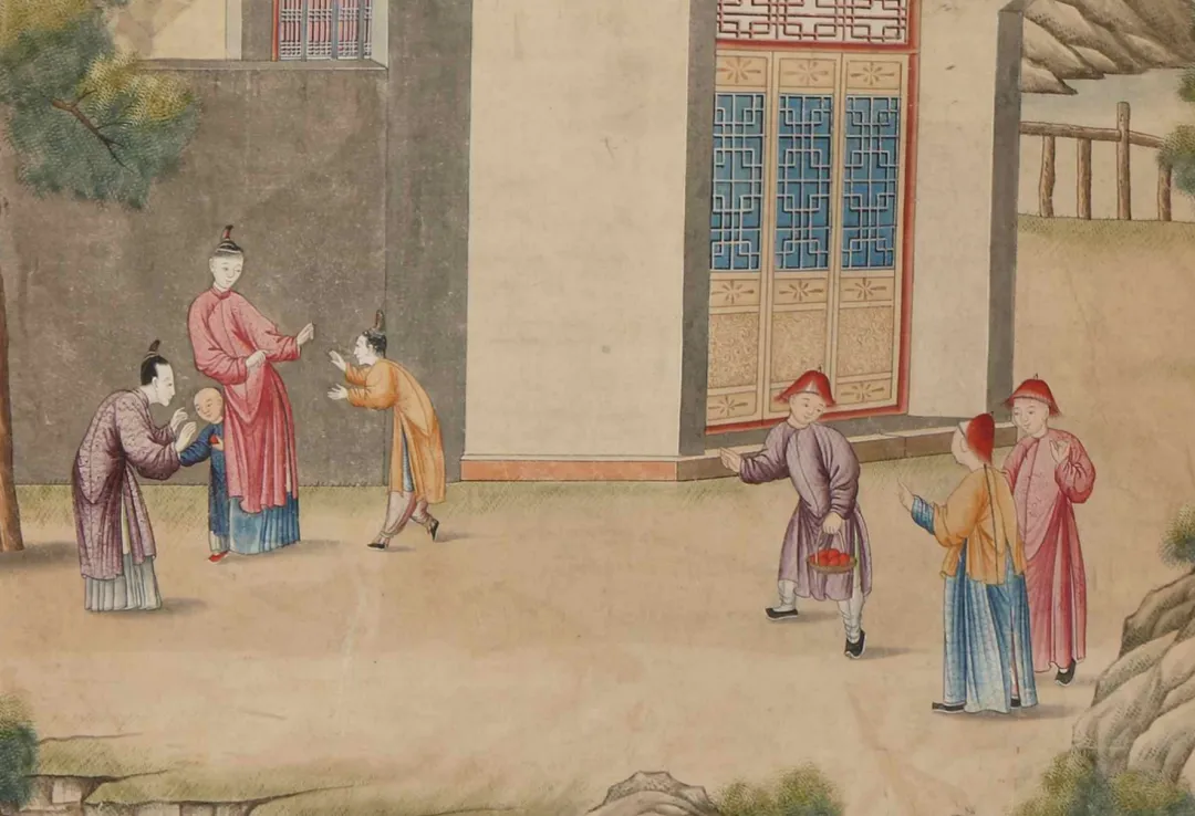 清乾隆广州手绘农耕商贸图外销壁纸(局部)