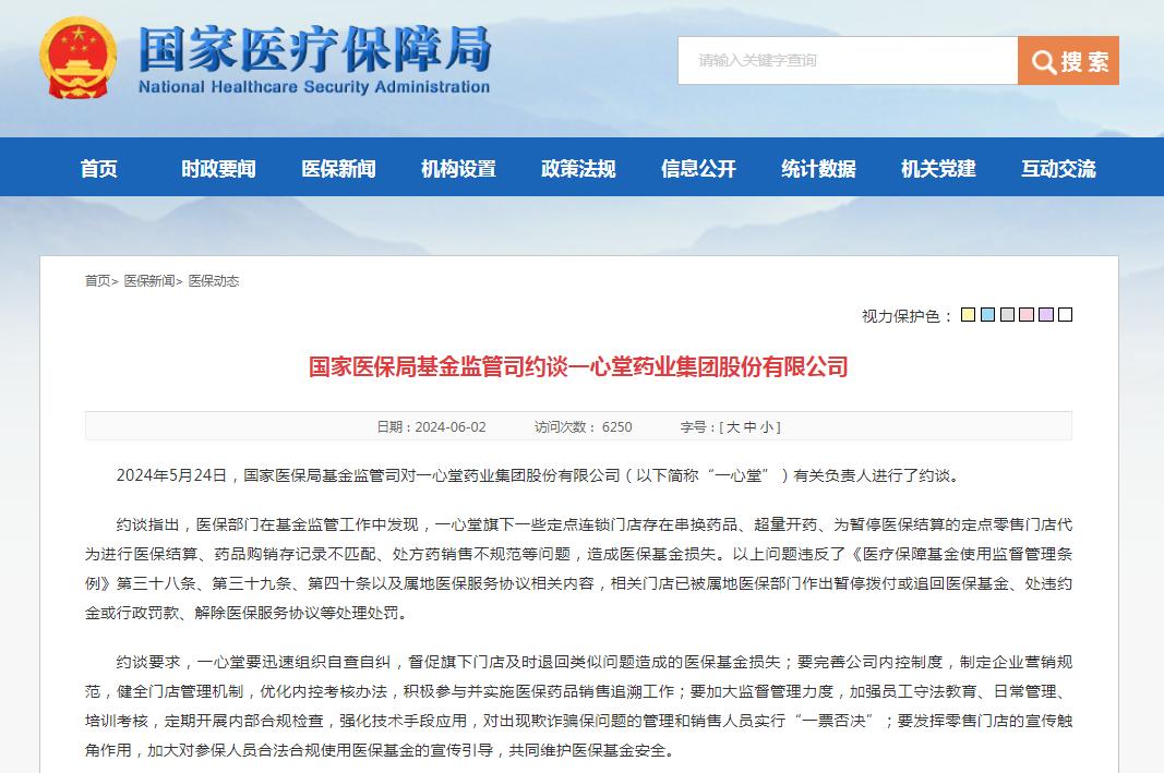 2024年5月24日,国家医保局基金监管司对一心堂有关负责人进行了约谈。约谈指出,医保部门在基金监管工作中发现,一心堂旗下一些定点连锁门店存在串换药品、超量开药、为暂停医保结算的定点零售门店代为进行医保结算、药品购销存记录不匹配、处方药销售不规范等问题,造成医保基金损失。