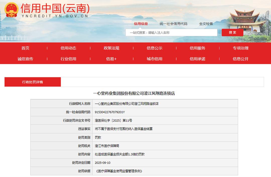 齐鲁晚报·齐鲁壹点记者于信用中国(云南·昭通)行政处罚栏了解到,10月12日,一心堂药业集团股份有限公司德钦河香中路连锁店因存在超量开药、未核验参保人医保凭证、无处方销售处方药等违规项目,德钦县医疗保障局对其发出行政处罚决定书医保处字〔2025〕第014号,责令其立即整改违规使用医保基金行为,责令其退回违规使用的医保基金1246.65元;对超量开药、未核验参保人医保凭证、无处方销售处方药等违规项目涉及基金处2倍罚款(1246.65*2倍、2493.3元)。