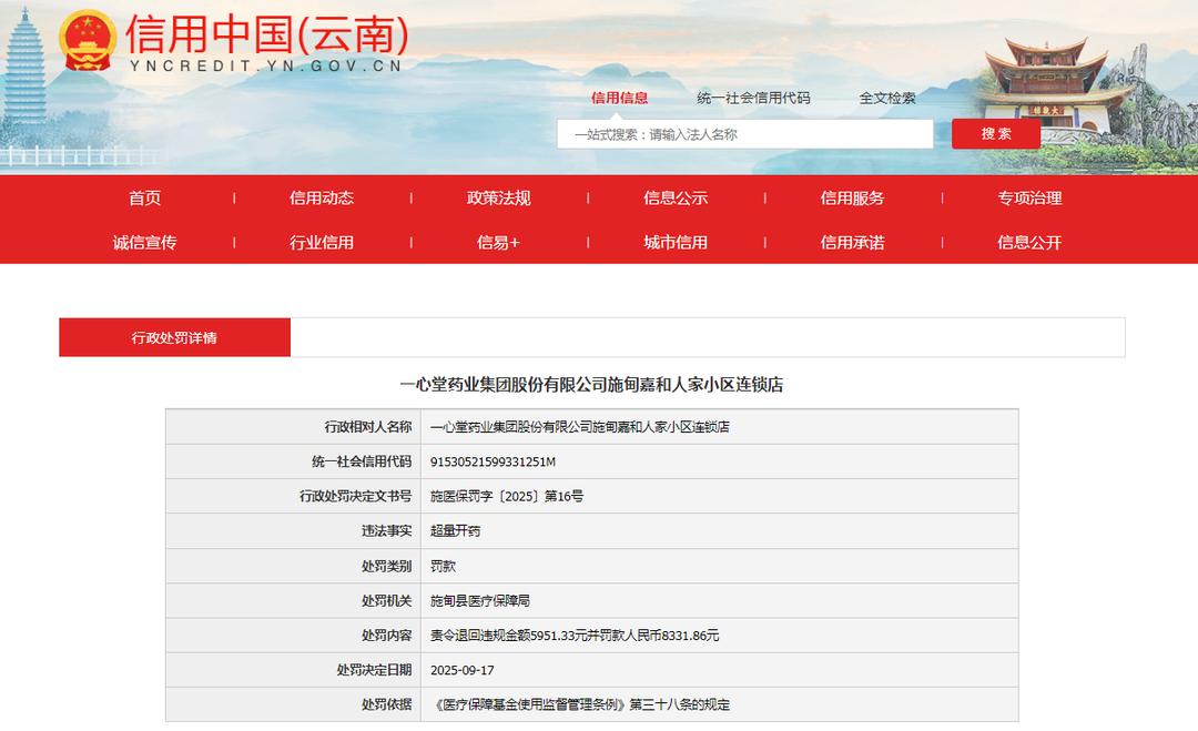 例如,信用中国(云南)9月17日公示的行政处罚详情显示,一心堂施甸嘉和人家小区连锁店因超量开药的违法事实,施甸县医疗保障局责令其退回违规金额5951.33元并罚款人民币8331.86元。