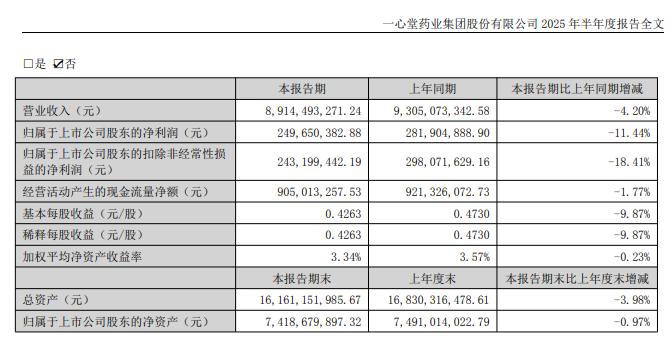 截至2025年6月末,一心堂门店总数为11372家,较年初净减少126家。营收方面,2025年上半年公司实现营业收入89.14亿元,同比下降4.20%;归母净利润为2.50亿元,同比下滑11.44%。