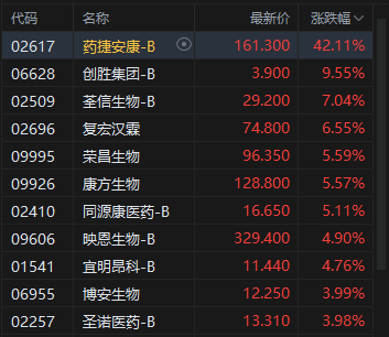 生物技术股走强,药捷安康涨超42%。中泰证券预计2025Q3医药板块整体业绩或将持续分化,创新药板块中部分优质龙头等凭借产品管线优化与国际化进展预计维持快速增长;CRO/CDMO行业经历短期调整后,受益全球订单恢复与运营效率提升,业绩有望逐步企稳;器械板块整体表现稳健,细分赛道如影像设备等已有回暖趋势,体外诊断考虑DRG/DIP推广等外部因素或阶段性承压;受政策与行业周期影响,部分中药及医疗服务企业仍面临短期增长压力。整体而言,我们认为医药板块三季度业绩有望逐渐回稳,建议关注部分业绩确定性高、增长动能充足、估值合理的优质标的。
