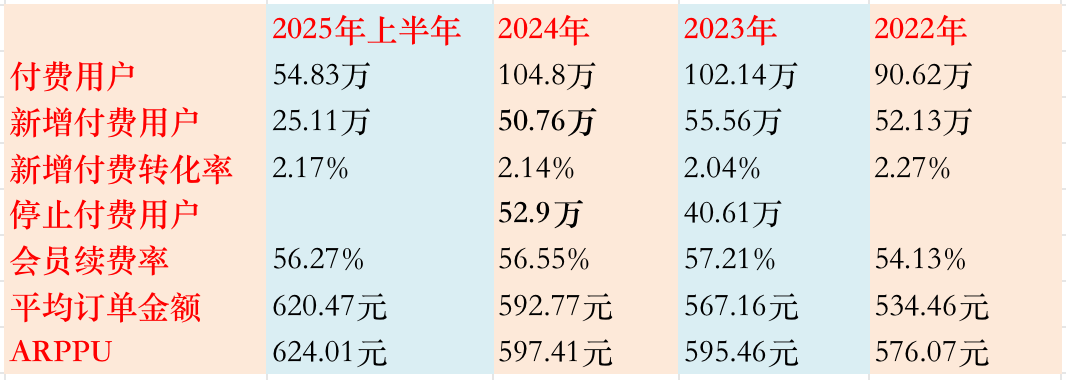 付费用户方面,2022年至2025年上半年,企查查的付费用户数分别为90.62万、102.14万、104.8万、54.83万。其中,新增付费用户数分别为52.13万、55.56万、50.76万、25.11万,新增付费转化率核算下来比例保持在2%左右,这一比例相对稳定。