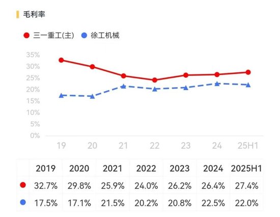反映在利润端,营收相差百亿的三一重工,却能在归母净利润上与徐工机械基本持平,2025年上半年甚至反超近10亿。