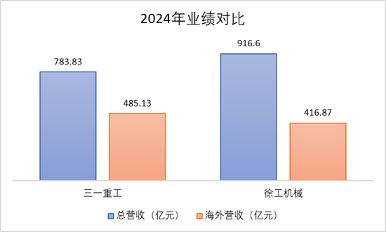 与国内龙头(000425.SZ)相比,虽然三一在总营收体量上仍有超百亿的差距,但在海外市场上已实现规模领先。