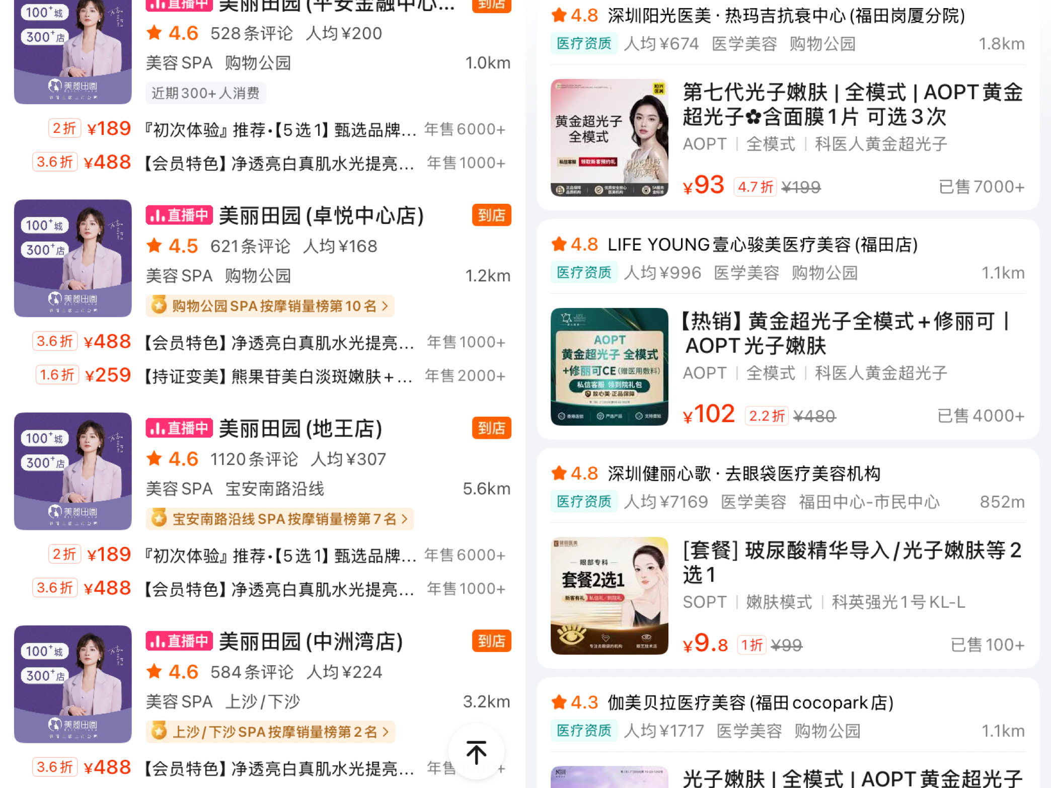 界面新闻在本地生活APP上搜索发现,以深圳为例,如美丽田园、思妍丽等品牌的皮肤管理项目价格大多在200元以上,对比来看,像光子嫩肤这样普及度较高的入门级医美项目,在多家医美机构的团购价格可以低至100元以下。