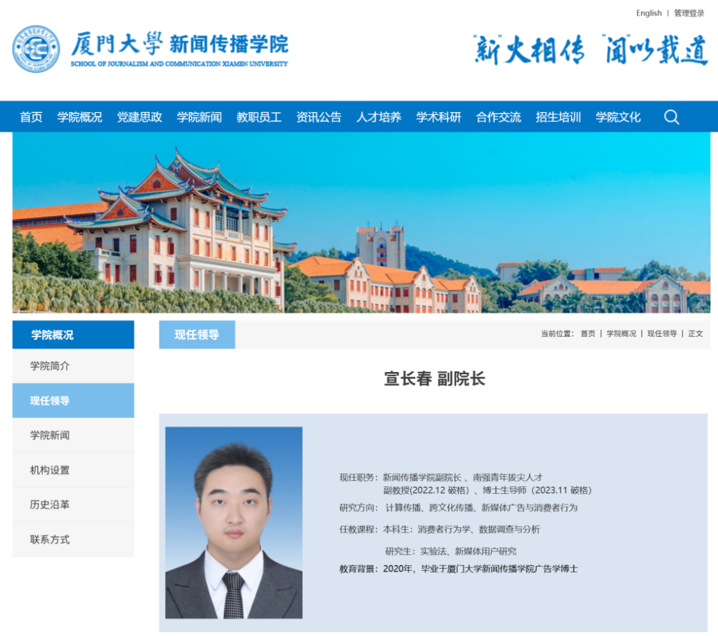 据厦大新传院官网资料,宣长春的研究方向涵盖计算传播、跨文化传播、新媒体广告与消费者行为等领域。其先后入选“福建省高层次人才”“厦门市高层次人才”和“厦门大学南强青年拔尖人才”。他于2022年12月破格晋升副教授,又于2023年11月破格聘为博士生导师。