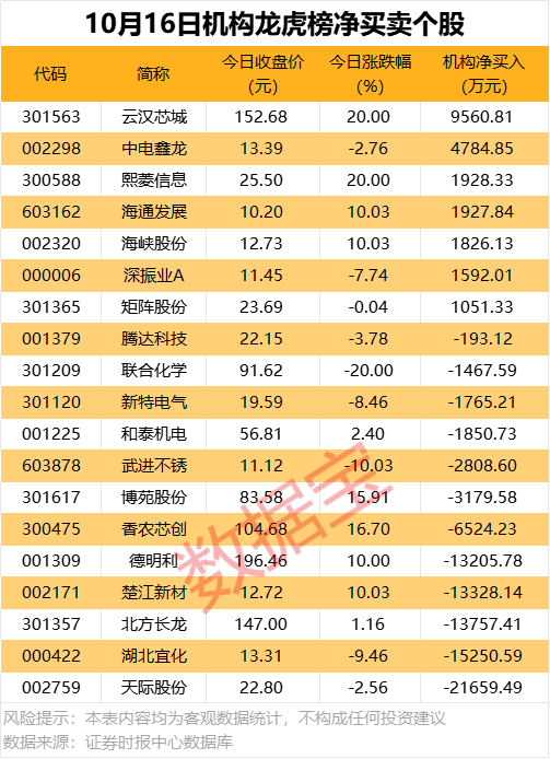 今日龙虎榜中,机构净买入的个股7只,净卖出的个股12只。获机构净买入金额居前,分别为9560.81万元、 4784.85万元 ;等个股也均获机构净买入超1000万元。