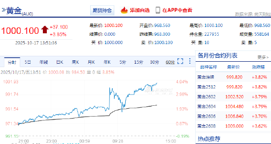 10月17日,沪金主力合约强势突破1000元整数关口,日内涨近4%,续创历史新高,年内涨超370元,涨幅超60%。