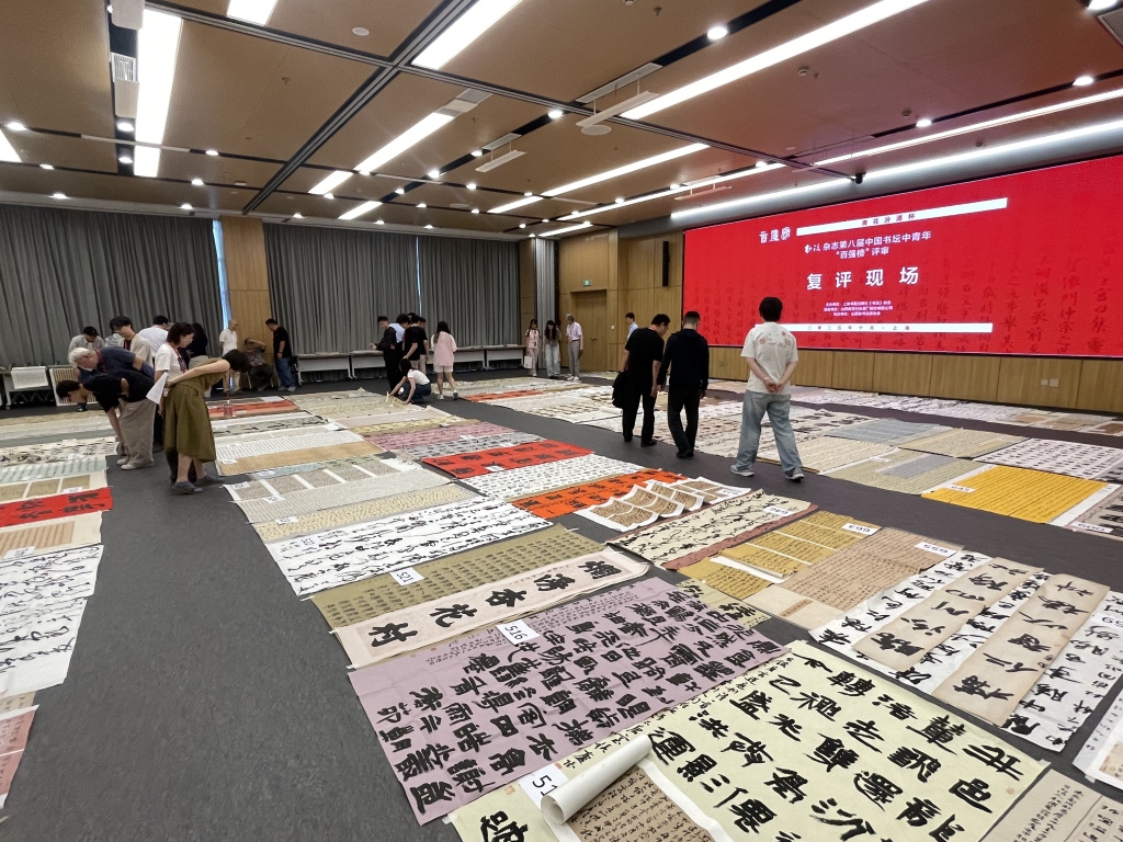 第八届中国书坛中青年“百强榜”终评现场,评委在释读书法作品的文字