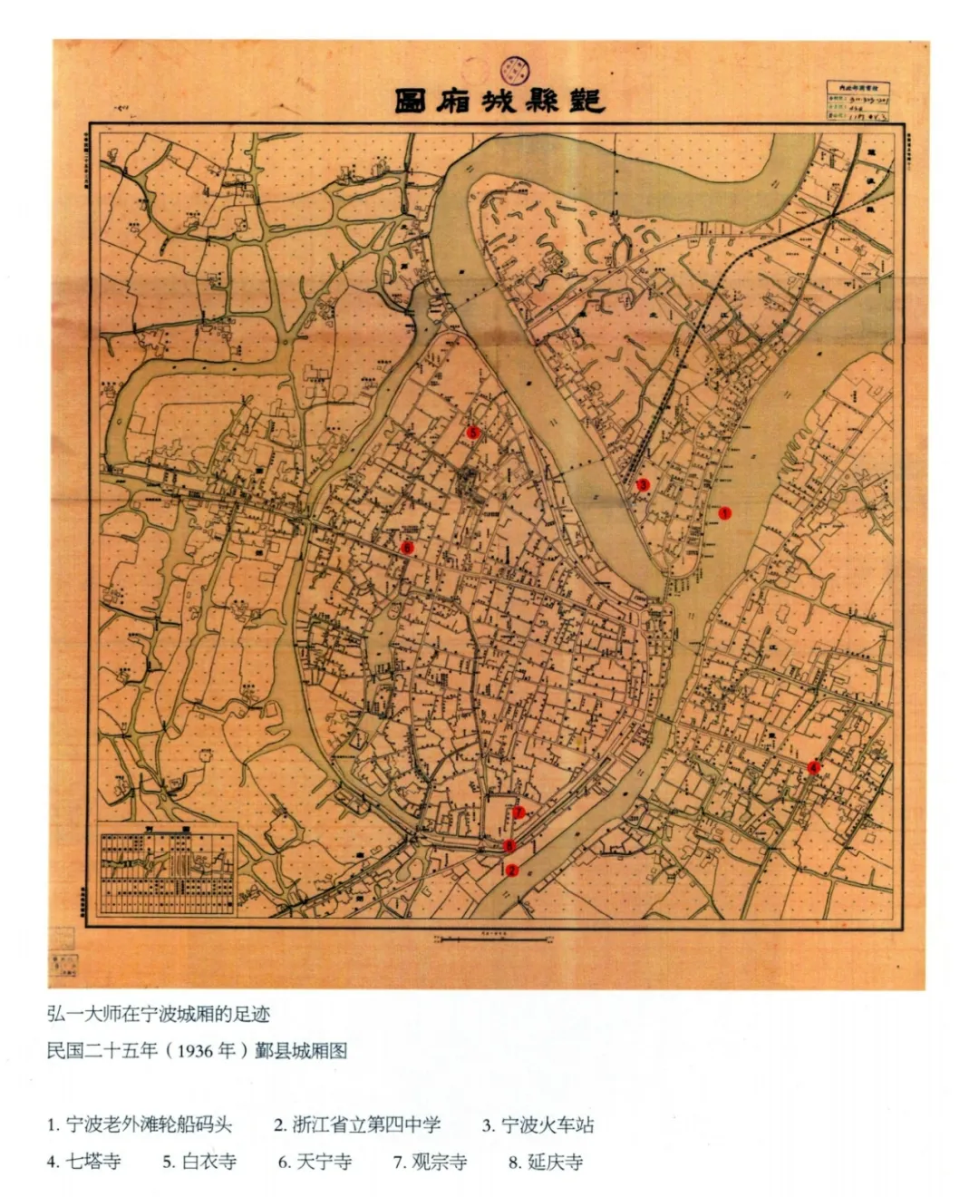弘一法师首次到访宁波为1924年6月(农历五月),自温州转道而来,于甬江畔轮船码头(老外滩码头)乘船前往普陀山,礼拜印光大师。宁波素有“四明佛地”之称,古刹林立,法脉绵延,弘一法师曾先后驻锡七塔寺、白衣寺、天宁寺、观宗寺、延庆寺等多处道场,讲律弘宗,影响深远。