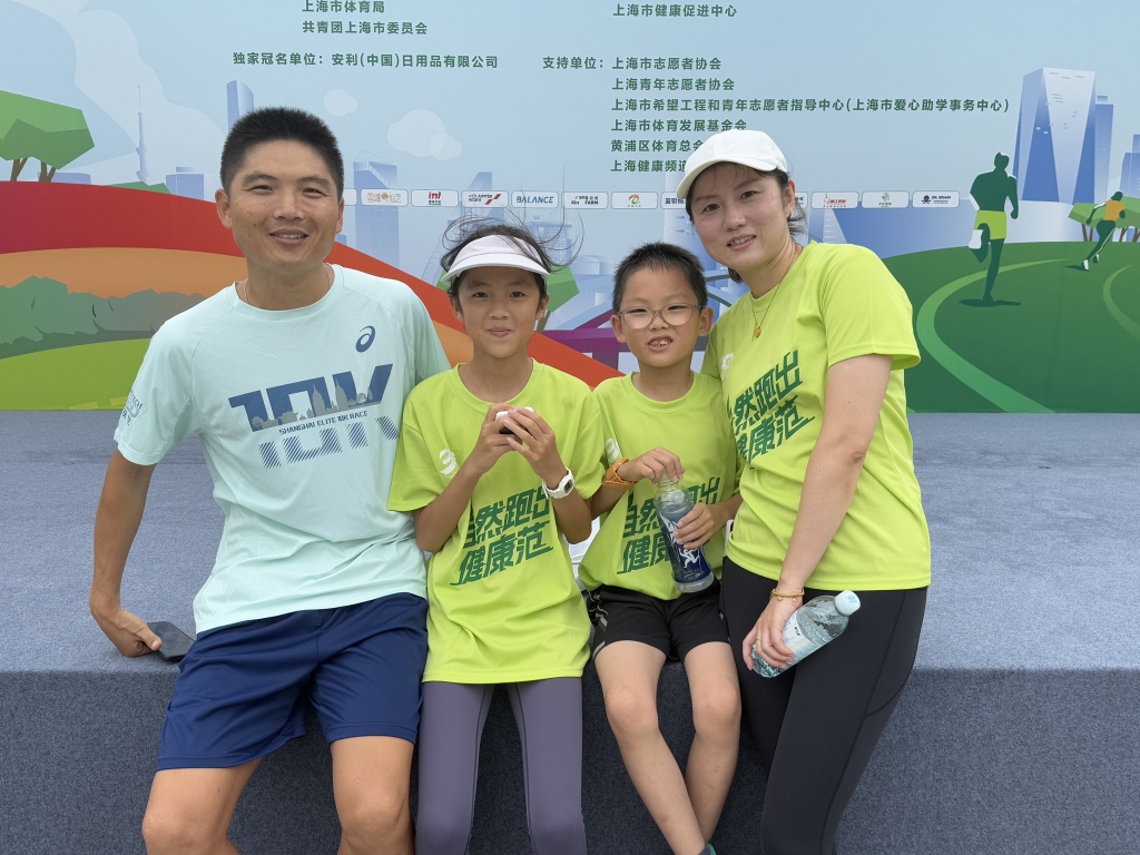 8岁的储辰忻(右二)和他的姐姐和父母一起参加慈善跑。