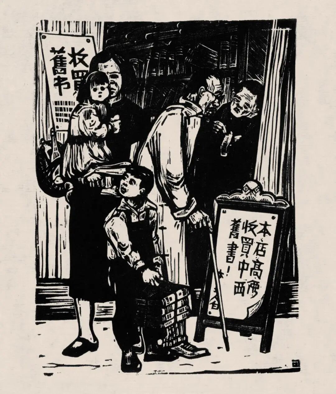 杨可扬1947年的《教授》,则以深沉的目光凝视着战后中国的知识分子群像。当时物价飞涨,民不聊生,学生上街游行,教师因欠薪而集体请愿,知识分子或卖旧书、或上当店……如此种种情况,激起作者的强烈悲愤,于是创作了一批有关知识分子困苦生活的木刻作品,《教授》就是其中之一。作品中教授的身份是假的,但生活是真实的。由于这个特别瞬间的聚焦,作品具有一种特别的感染力。