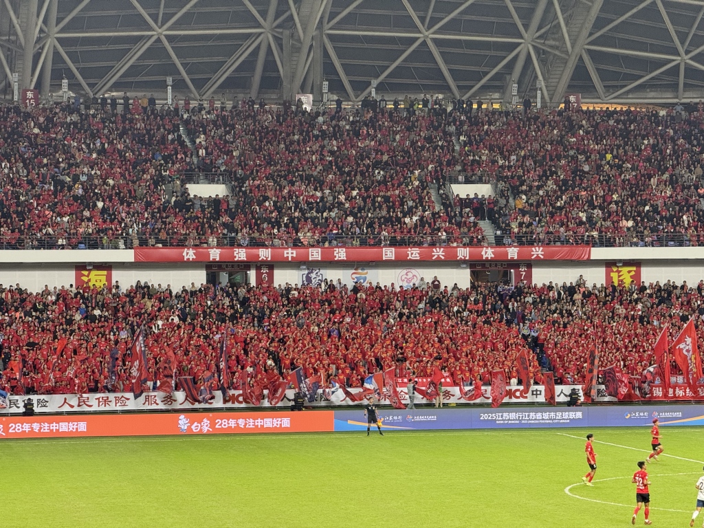本场苏超半决赛南通体育会展中心体育场共有32069人观赛,除了远道而来的少数无锡队球迷,南通球迷目测占据3万人左右,赛后身穿红色球衣的南通队球迷迟迟不愿离去,这是本赛季南通队最后一个主场,南通队全队也绕场一周致谢球迷,而留在体育场的球迷全部高喊“一起去南京”。即将开始的苏超决赛,南通队球迷也将继续跟随球队,期待见证最终冠军的到来。