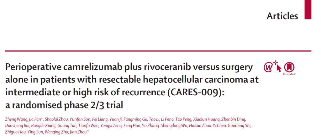 19日会议当天,该研究成果同时以原创论著(Article)形式在国际顶级期刊《柳叶刀》在线发表。Clinical Trial(第2版)主编、美国俄亥俄州立大学威克斯纳医学中心Timothy M. Pawlik教授和德克萨斯大学MD安德森癌症中心Ahemd Kaseb教授在《柳叶刀》同期发表评论:CARES-009等研究凸显了肝癌多模式治疗方面取得重要进展,这对推动围手术期系统治疗继续发展并在肿瘤治疗中占据更重要的地位,具有引领价值。