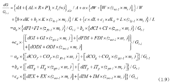 dG/Gt—1为GDP增长,dA为创新TFP增量,dW为自然增量劳动力,dK为自然增量资本,dL为自然增量土地,dLd为工程调水新开发土地,A为全要素生产率(TFP),AL为资产化改革的项目;W为劳动力,K为资本,L为土地,a和b是体制不变自然投入时的劳动和资本产出系数,相加为100%;a、b1和c1是劳动、资本和土地市场化改革时的投入产出系数,相加为100%;dFI和I为居民自然新增收入和居民总收入,dCI和CI为企业自然新增收入和企业总收入,dGI和GI为政府自然新增收入和政府总收入;dCOf和COf为居民自然新增消费支出和居民消费总支出,dCOg和COg为自然政府新增转移民生支出和政府转移民生总支出,dITg和ITg国有自然新增投资和国有总投资,dITp和ITp为民间自然新增投资和民间总投资,dFDI和FDI是国际直接投资新增额与国际直接投资总额,dODI和ODI是对外直接投资新增额和对外直接投资总额;dEX和EX为出口自然新增额与总出口额,dIM和IM为进口自然增长额与进口总额,分配环节和需求领域式中的aa、ba和ca分别为居民、企业和政府可支配收入占国民总收入的比例,相加为100%;ad、bd和cd分别为需求侧投资、消费和出口各自占GDP的比例,相加为100%;It(w)为开关差分变量1或者0,z为各项目差值,其乘以各对应项目为体制性剩余或者潜能,mi是体制改革对剩余和潜能的年度分摊强度,其总和为100%。