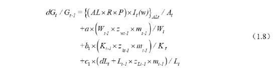 从宏观经济方面,本文采取了生产函数模型、总量分配模型和凯恩斯宏观需求模型动态联立的方式,观察从供给到分配,再从分配到需求的宏观经济流动、循环和平衡。据此动态体制结构性的流程,笔者假定体制不变为自然经济增长,将体制不变供给、分配和需求的流动体变量部分,与体制变动影响的生产率、财富溢值、收入提高和需求潜能相加和联立,建立了以下供给-分配-需求联立计算系统(1.9)。