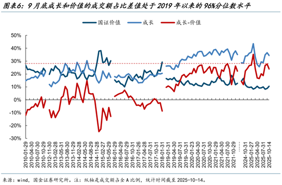 从成交额占比分化来看,2019年前后成为了明显的分水岭:2019年之前成长和价值之间的成交额占比差值中枢维持在0%左右,但波动极大;而2019年之后成长和价值之间的成交额占比差值中枢明显抬升,且波动也明显降低,基本上都是以成长风格的成交额占比波动为主导。我们认为这背后可能的原因是2019年之前的成长偏小盘化,而2019年之后核心资产崛起,大盘成长开始成为主导;这一轮科技成长内部也呈现了类似的大盘风格特征。当前来看,在10月出现切换迹象之前,9月底成长和价值之间的成交额占比差值虽然不算极端,未突破2025年2月的峰值,但其实已经接近2021年的顶部水平,处于历史相对高位(2019年以来的历史分位数为96%)。
