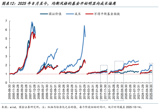 历史上看,2016年之前的三轮牛市中,均衡风格的投资者基本上更偏向价值风格,走势与价值风格更接近;而2016年之后均衡风格的投资者最终更多偏向成长风格。这一轮牛市中,一直到2025年7月底之前,其实均衡风格的基金与价值风格更匹配,但到了8月至今,均衡风格的基金开始明显向成长偏离,这可能意味着的是有很多均衡风格的投资者在8月之后切向了成长风格。类似的事情其实也发生在2019年年中至2020年年中,但到了2020年年中风格出现切换迹象时,均衡风格的基金与成长之间的差距开始逐步被拉开,但均衡基金的波动率明显要比成长更低,这背后可能意味着的是均衡风格基金在成长和价值之间的再均衡,因此也就带来了之后的风格反复,而非成长的绝对占优。