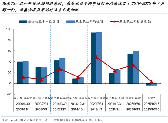 从全部普通股票型、偏股混合型、平衡混合型以及灵活配置型的基金(有多个分级基金的仅统计A级基金)收益表现来看,切换之后往往这些基金之间的收益率标准差都会出现明显的下降,而收益率的中位数和均值也会明显下降。2025年10月以来出现切换迹象之前,2024年9月13日至2025年9月30日,基金收益率的中位数和均值仅次于2019-2020年7月那一轮,而基金收益率的标准差也是如此。而2025年10月以来三个指标都出现了明显的下降。