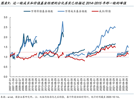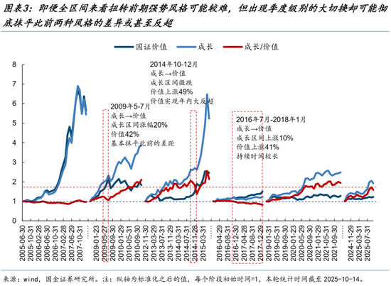 在10月以来出现风格切换迹象之前,9月底本轮成长和价值之间的分化程度其实已经达到了2020年7月、2014年7月以及2010年7月的水平,这几个时点来看:2020年7月风格开始出现反复,2014年7月也是接近风格切换的前夕,而2010年7月实际上也已经进入到强势风格占优的最后阶段。