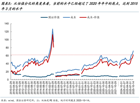 这一轮风格分化主要集中在成长和价值之间:2024年9月13日至2025年10月14日,TMT指数相较于国证价值的相对收益高达81%,而小盘指数相较于大盘指数的相对收益仅为21%。这一轮成长和价值分化背后其实是产业趋势VS宏观经济趋势的分化,两者之间基本面实际/预期的差异最终演变为收益率/估值的明显分化和成交热度的分化。历史上看触发牛市中风格切换的因素主要就是上述三个:(1)盈利相对优势转换背后是宏观环境出现明显变化,导致价值相较于成长的盈利预期开始收敛或者触底反转。比如2014年下半年开始出现的房地产政策、货币政策放松与金融改革;2020年7月疫后复苏传导到更多传统行业等。当前来看,截至2025年Q2价值相较于成长的盈利优势并未形成,底部也还未形成,未来需要重点关注基本面预期变化。(2)估值分化背后其实与基本面预期存在明显关联,但由于成长风格的估值波动明显高于价值,因此实际上成长和价值之间的估值分化直接取决于成长估值的变动本身,背后是市场对于成长的盈利预期乐观程度终会有一个上限。当下来看,可以发现这一轮成长相较于价值的估值扩张水平已经超过了2020年年中时出现风格反复的水平,可比时期仅有2014-2015年,相当于已经达到2015年3月时的水平,即当时牛市中后段。(3)从成交额占比分化来看,在10月出现切换迹象之前,9月底成长和价值之间的成交额占比差值虽然不算极端,未突破2025年2月峰值,但其实已经接近2021年的顶部水平,处于历史相对高位(2019年以来历史分位数为96%)。总结来看,历史上牛市中出现成长和价值切换的阶段,基本面实际/预期都会出现边际变化;估值分化其实并无绝对值意义上的锚,但可以参考2014-2015年和2021年顶部水平;成交额占比分化则可以参考2019年以来的历史分位数水平。整体而言当前具备估值分化和成交额占比分化发生切换的触发条件,但基本面方面的变化可能还需要进一步等待。