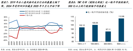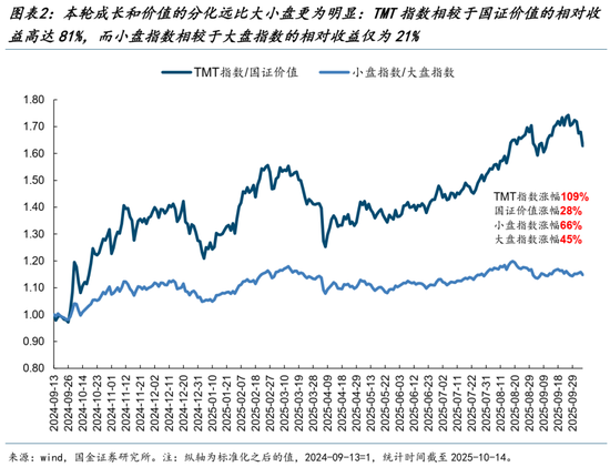 基于上述前提,再来讨论牛市中的风格切换问题。由于成长在不同时期市场的认知不同,对应的行业也不同,国证成长指数的编制也具备财务指标的滞后性,而这一轮牛市中明显TMT是最典型的成长风格代表,因此我们用TMT行业来代表这一轮牛市中的成长风格;价值风格的分歧较小,因为我们用国证价值来代替。大小盘风格方面我们采用申万的大小盘风格指数作为表征。那么在当前这一轮牛市中,其实风格分化最为明显的是成长和价值之间,而大小盘之间的分化并没有那么明显:2024年9月13日至2025年10月14日,TMT指数相较于国证价值的相对收益高达81%,而小盘指数相较于大盘指数的相对收益仅为21%。