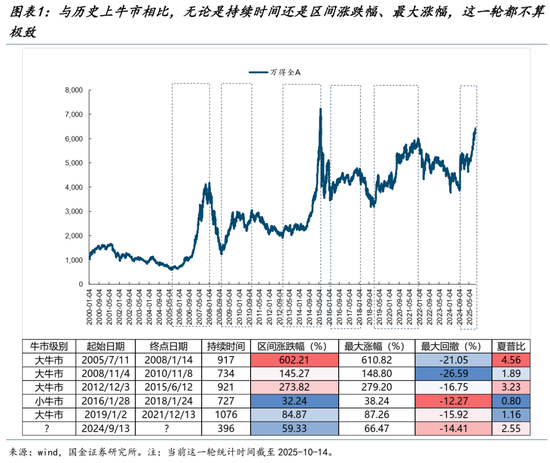 首先,绝大多数投资者应该会认可这是一轮牛市,而且目前很少有人会认为这一轮牛市已经结束,因为与历史上典型的牛市相比,这一轮(2024-09-13至2025-10-14)持续时间最短、区间涨跌幅仅仅高于2016年年初至2018年年初那一轮小牛市,最大涨幅也是如此。