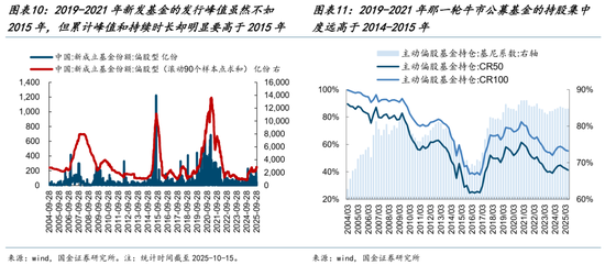 指数的收益率其实并非与投资者实现的收益率完全是一个概念,如果我们用万得价值基金指数代表价值型风格基金经理的投资整体回报,用万得成长基金指数代表成长型风格基金经理的投资整体回报,那么我们会发现虽然指数层面成长和价值的分化最大的牛市是2014-2015年那一轮,但基金经理层面成长和价值选手的收益率分化最大的时候却是2019-2021年那一轮牛市。而这一轮分化最大的时刻就是在9月底,分化的水平其实已经接近2014-2015年的峰值水平,但距离2021年的峰值水平仍有较大的距离。不过不容忽视的是2021年的峰值水平背后是公募基金的天量发行以及随之而来的公募“抱团”的极致化。