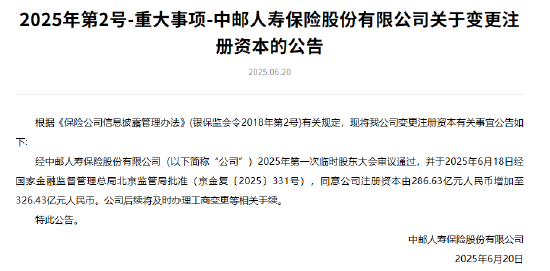 此前在6月20日,中邮保险曾发布公告称,经公司2025年第一次临时股东大会审议通过,并于2025年6月18日经国家金融监督管理总局北京监管局批准(京金复〔2025〕331号),同意公司注册资本由286.63亿元人民币增加至326.43亿元人民币。公司后续将及时办理工商变更等相关手续。