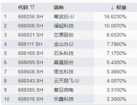 图:科创人工智能ETF(589520)标的指数前十大权重股(数据截至2025.9.30)