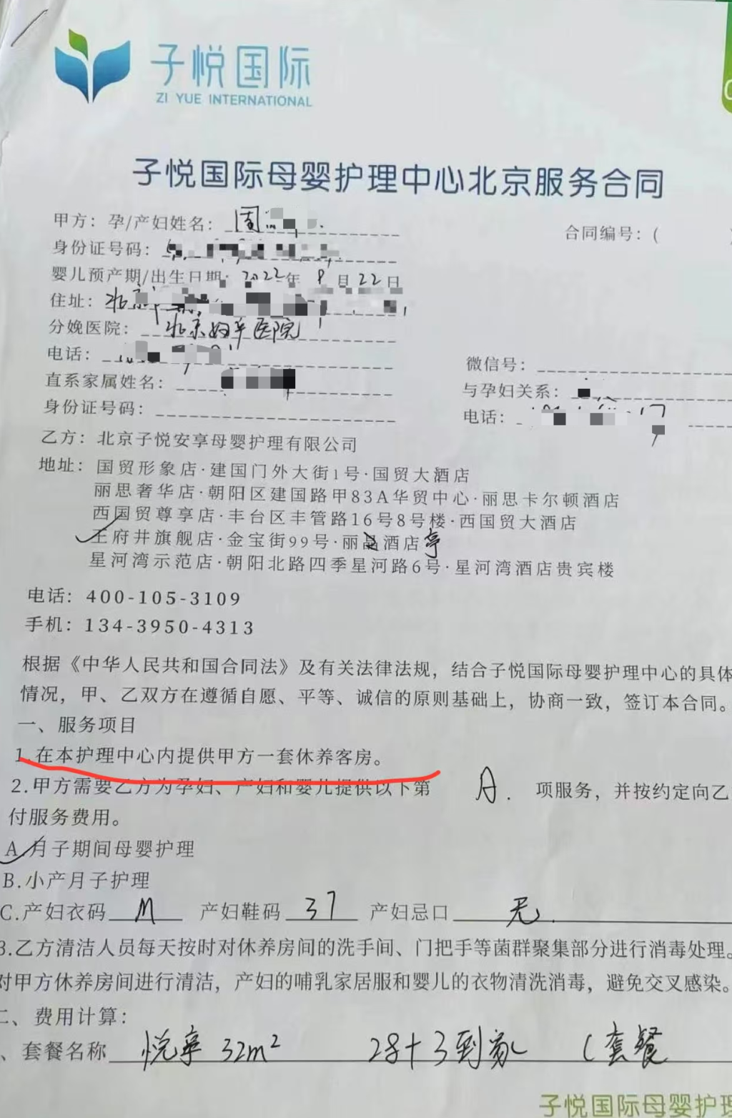 周女士称,在酒店客房坐月子期间,子悦国际母婴护理中心按照合同约定提供了护理服务、餐食、产康等,她在28天的月子结束后顺利离开酒店。