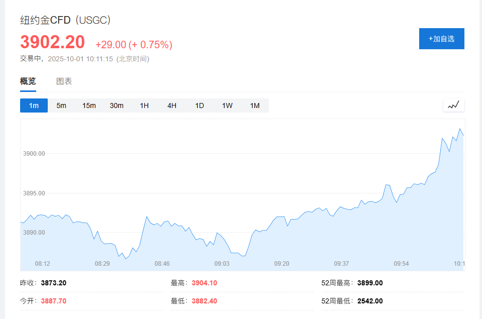避险情绪推动COMEX黄金升破3900美元/盎司,再创纪录新高。现货黄金上涨0.2%至每盎司3865美元,再次逼近周二创下的3871.45美元的历史高点。