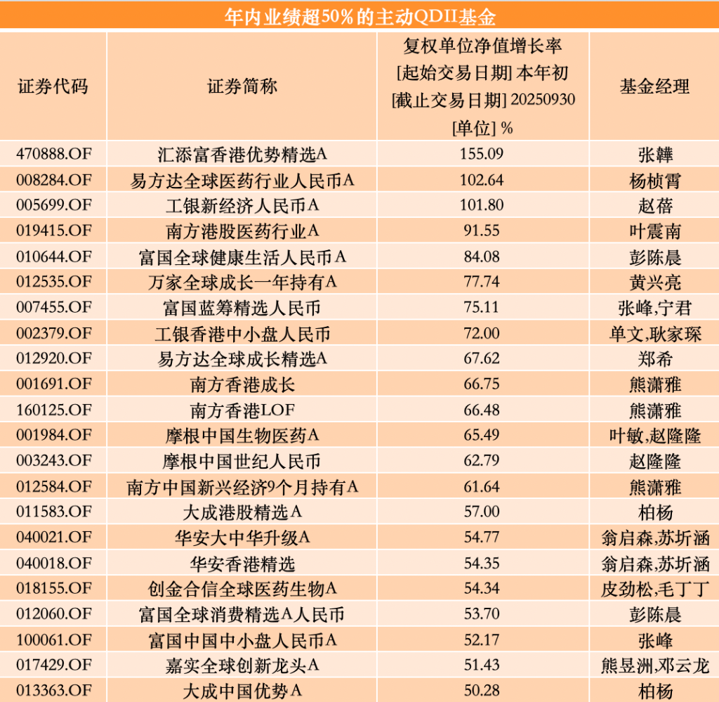 另再单独筛选主动QDII基金的年内业绩情况来看,汇添富香港优势精选、易方达全球医药行业人民币、工银新经济人民币包揽收益率前三名,且均为翻倍基。