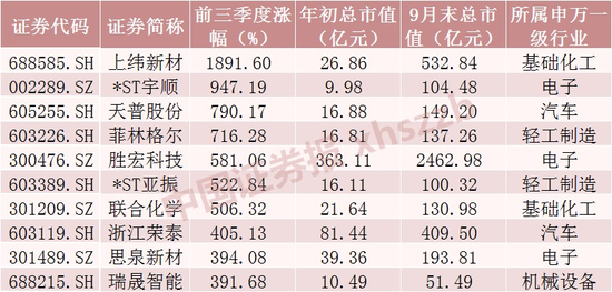 前三季度A股十大牛股分别为上纬新材、、、、、、、、、,其中涨幅最大的上纬新材累计上涨1891.60%,*ST宇顺涨逾940%,天普股份、菲林格尔均涨逾700%。