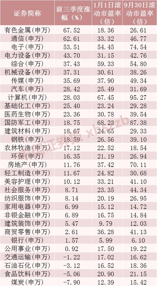 行业方面,有色金属、通信、电子行业领涨。个股方面,剔除前三季度上市新股后,超4300只股票上涨,最牛股票累计涨近1900%。