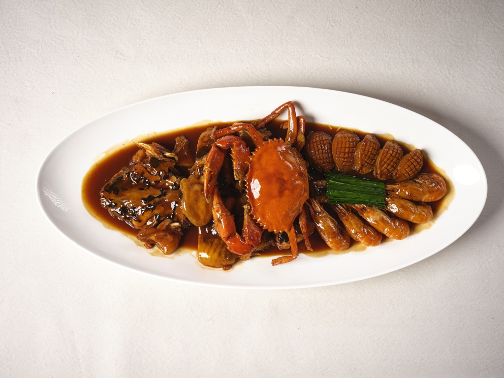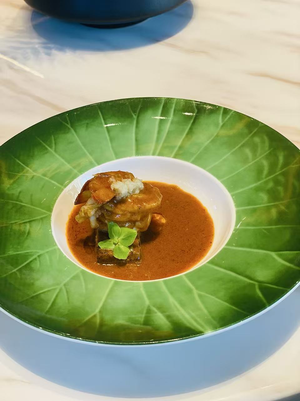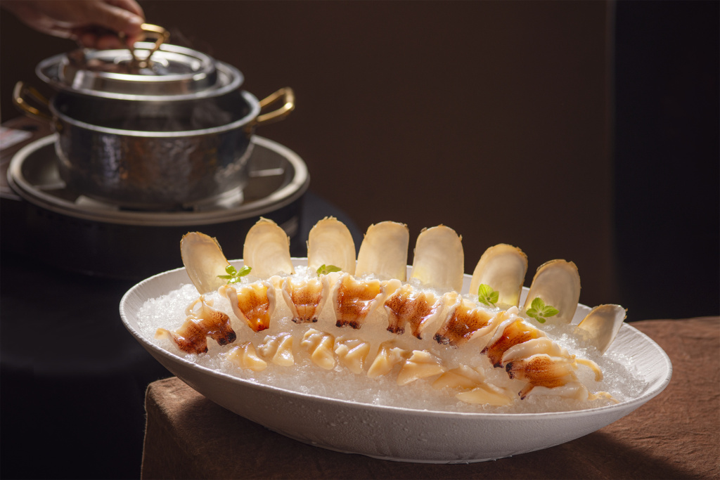 鮰鱼一锅鲜,是一道很有意思的烩菜。五斤左右的长江鮰鱼配以罗氏虾、青蟹及鲍鱼等食材,通过精准的火候控制,让河鲜的醇厚与海鲜的甘甜巧妙融合,口感扎实中又带有一丝灵动,端的是江南的顶尖鲜味。