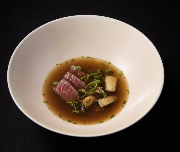 以使用了洋葱、西芹等原料的蔬菜汤作为熬制牛高汤的“水”来进行长时间的吊汤,从而保证汤汁的鲜甜醇厚,之后再将其澄清,以获得牛清汤。同时,Dario还会将切好的大量菌菇加盐和百里香,将其用保鲜膜封好之后直接送入蒸箱蒸制几个小时,以利用温度来萃取菌菇原汁,形成风味极其浓郁的菌菇汤。等牛清汤和菌菇汤全都处理完成,Dario便会利用高温牛清汤与低温菌菇汤的对冲来完成最终的步骤,“这是一道在上世纪中叶非常流行的意大利汤品,但因为工序复杂、耗时太长而逐渐被遗忘,”Dario说,“我想要把这道菜复刻出来,让更多的食客可以看到意大利菜本身对于汤的坚持,而这也跟中餐里对于汤的重视,如出一辙。”