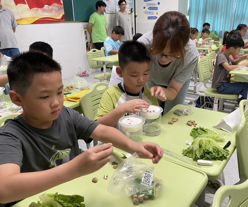 在爱心暑托班的桃子课上,孩子们的指尖先触到了绒毛。我们教大家掂重量、看果纹,小姑娘们把桃子捧在手心比脸蛋,男孩子则争当“农残检测小侦探”。轮到做水培花生时,每个孩子都收到透明培养瓶,往里面铺海绵、点清水,小心翼翼地把花生摆成小圆圈。“老师,它会变成花生芽吗?”一个男孩举着瓶子追问。不久我们就收到学生发来的照片,窗台上的花生冒出了白芽,旁边压着张歪歪扭扭的观察日记,画着太阳和笑脸。更让我们心头一暖的是,那个总扎着双马尾的女孩特意跑来和我们说:“等它长大了,我要摘给外婆煮盐水花生。”培养瓶在阳光下晃出细碎的光,我们突然感到,小朋友们是把对田野的牵挂种进了心里。