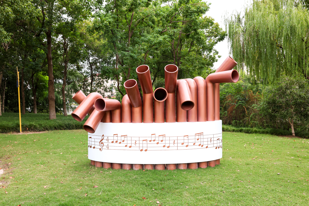漫步上海闵行文化公园,观者不仅能够欣赏到来自知名艺术家的精彩雕塑作品,更能感受到雕塑艺术与在地科创文化、音乐氛围的深度对话:《城市协奏》以不锈钢管阵模拟乐器旋律,底座嵌入《青春闵行》乐谱符号,奏响城市节奏;《途兔》以航天科幻主题演绎玉兔形象,贴合闵行作为上海科创中心重要承载区的发展定位;《绽放》则以上海市花白玉兰为意象,传递城市开放包容的精神特质,同时也与闵行文化公园内千余株玉兰相得益彰。这些作品不仅点缀公园景观,更成为闵行文化身份的视觉载体,引导市民在漫步中思考现代城市的可持续发展路径。