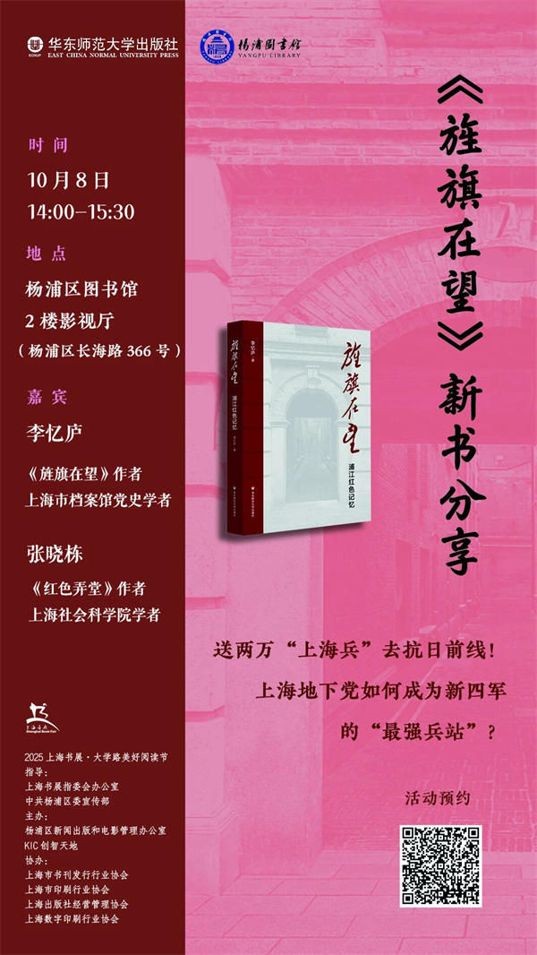 1921-1933年中共中央在上海时期,在上海参加革命的第一代共产党人具有很高的政治文化素养,他们深入工厂做工,巧设秘密联络点,组织机构用化名,出版革命书籍和报刊等。抗战时期,上海先后输送到新四军的各类人员共有2万余人,有力地充实了新四军的人力资源。本场讲座中,《旌旗在望》的作者李忆庐将通过真实的史料,再现革命的历史现场,让读者感受中国共产党人信仰的力量,感悟立体丰富的共产党人和革命力量的苍莽蕴籍。讲座之后,李忆庐、《红色弄堂》作者张晓栋以及两本书的责任编辑将展开三方对谈,共探革命历史的深层价值。