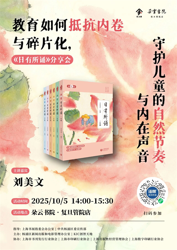 《礼记》有言:“温柔敦厚,诗教也。”诗歌不仅是文字的艺术,更是心灵的滋养。正如一生致力于传播诗词智慧的叶嘉莹先生所说:“中国古典诗歌可以让人心不死。”今天,我们如何让诗歌教育真正走进孩子的生命?10月5日,上海教育出版社美文工作室负责人刘美文将与大家分享《日有所诵》,带家长和孩子一起,用诗歌与母语、与内心、与世界对话,守护孩子的自然节奏与内在声音。