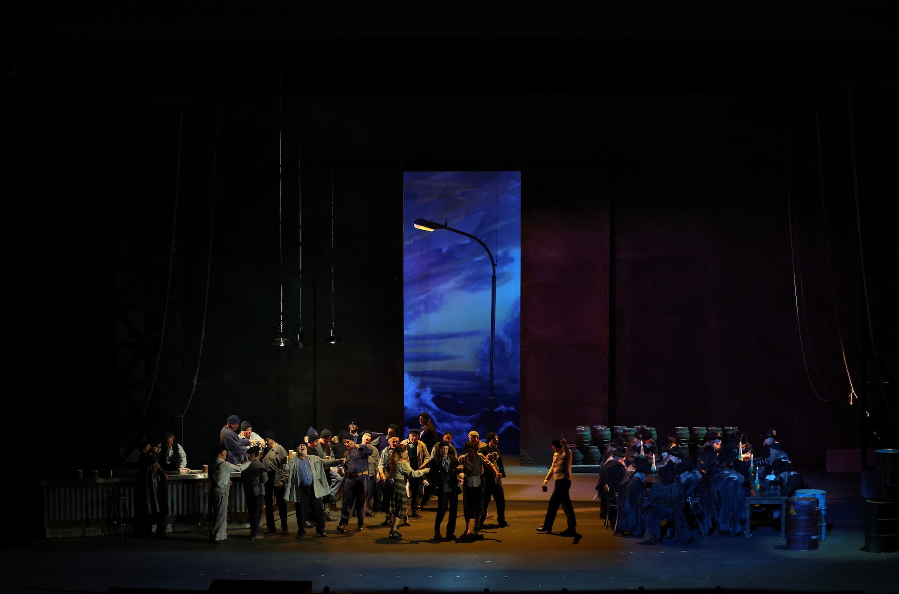 他对歌剧中水手间的酒文化细节捕捉得淋漓尽致。第一幕,冒失鬼水手为荷兰人和船长上红酒时给两位展示红酒标签,被船长一把抢过酒瓶;谈成婚嫁时两位的玻璃杯被换成高脚杯,船长一把夺过荷兰人面前的纯金高脚杯;第三幕的订婚吃席中,水手喝酒喝到把酒桶套在头上拔不下来,这些展现人物性格特征,强化剧情设置的细节呈现才见导演功底。不过导演对剧终设定作了大幅更改,以自杀式爆炸声盖住弱收,影响了音乐的原有形态,也算是其招牌。早先在东京文化会馆,他在导演理查·施特劳斯《无影女》时索性砍去了第三幕,与之相比在上海的更改毕竟收敛许多。康维奇尼的做法符合欧洲导演为先(Regietheater)的制作理念,效果见仁见智,却也让国内同行看到了歌剧导演行当的更多可能性和延展性。